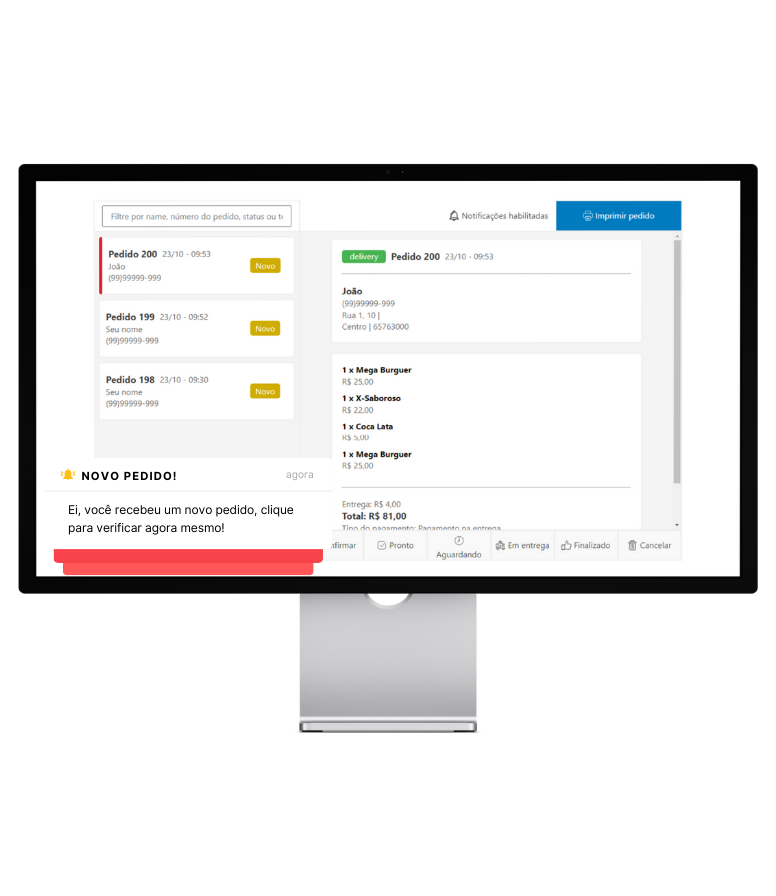 Com o Sistema de Gerenciamento de Pedidos, sua equipe tem total controle sobre o fluxo de pedidos. Acompanhe tudo em um só lugar: receba notificações instantâneas de novos pedidos, imprima comandas facilmente e atualize o status em tempo real. Esse sistema garante uma operação mais ágil e organizada, desde o atendimento até a finalização do pedido, proporcionando eficiência e rapidez ao seu restaurante.